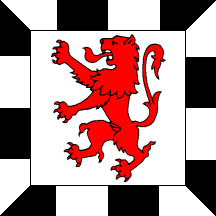 Argent, a lion rampant Gules, bordered Sable and Argent chequy.