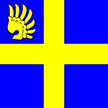 Azure, a Cross Or, in canton a Wing of the same.