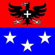 Per fess Gules an Eagle displayed Sable beaked, langued and membered Argent ensigned a cross couped of the last, and Azure three Mullets of Five, two and one.
