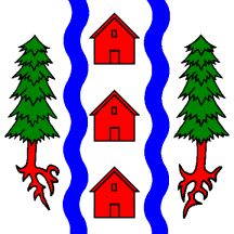 Argent, between two Pine Trees Vert eradicated Gules and as many pallets wavy Azure three Houses Gules.