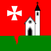 Divided by a pale wavy Argent in Azure a Chapel of the first and Gules a Cross pattee of the first.