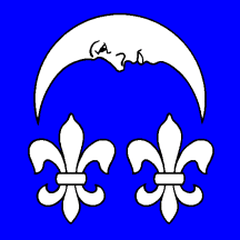 Azure a Crescent Moon inverted Argent and in base two Fleurs-de-lis of the same.