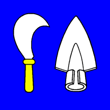 Azure a Sickle Argent pointed inwards handled Or and a Ploughshare of the second.