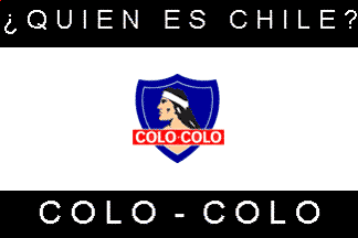 This is a white flag with the Colo Colo emblem on it, just like the official (?) flag, but with two black horizontal stripes added top and bottom, reading «¿Quién es Chile?» (=«Who is Chile?», above) and «Colo-Colo» (below). António Martins, 06 May 2006