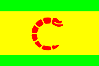 green, yellow, green flag. In the center is a red "C" in the form of a shrimp. Image after