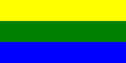 The flag of Sotará is horizontally divided yellow-red-blue.