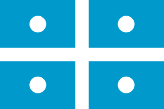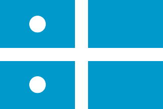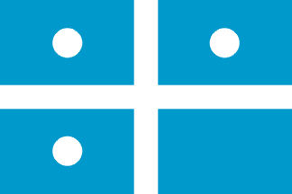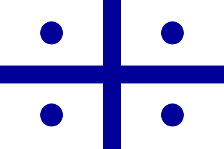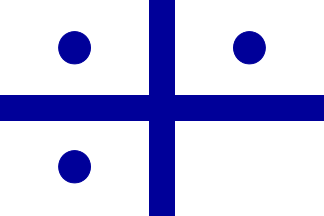 Blue field with a white cross and a white disc in each of the