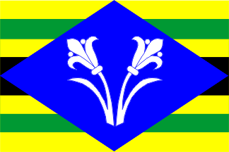 Flag: 7 horizontal stripes yellow - green - yellow - black - yellow - green - black; over all a blue lozenge charges with two white lilies.