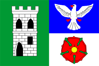 Flag: a green hoist charged with a white castle-tower; the fly is blue