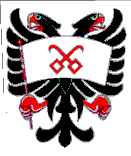 štítě. Orel drží v pravém pařátu na červené žerdi stříbrný prapor s červenými