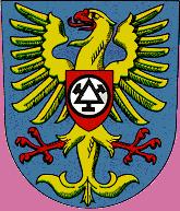 Azure a Těšín Eagle Or armed and langued Gules. It has a Gothic escutcheon