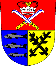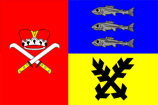 under a ducal crown; on blue three grey fishes placed vertically; on yellow