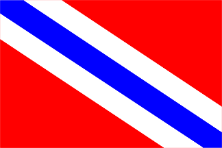 Description: red, a hoist diagonal of three white-blue-white stripes