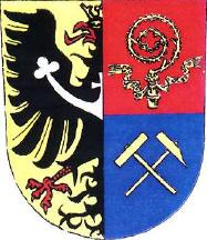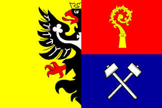 Description: sinister per fess gules and azure, crozier or, miner tools