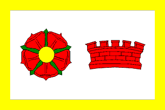 Arms: argent bordered or, a flower gules; surmounted by a mural crown