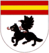 webpage: white with a black raven armed red riding a wolf passant tongued