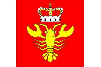 Flagdescription: three vertical stripes of white and red, proportioned 1:4:1; in center a yellow lobster, face up, under a white crown.