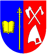 yellow; on red in top two crossed axes; in bottom a ploughiron, all white.