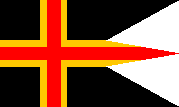 On a black field a red Scandinavian cross, fimbriated golden.