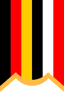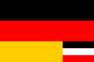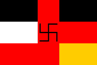 A flag divided vertically, the hoist half black-white-red, the fly half black-red-gold; in the center a vertical stripe of red with a black swastika. The flag-bearer is typical upper middle-class (with a top-hat). Caption: "Dreieinig, minnig, treu, das Hakenkreuz ist auch dabei" ("Triune, lovely, faithful, the swastika takes also part"). Source: Kuhn 1991 [kuh91].