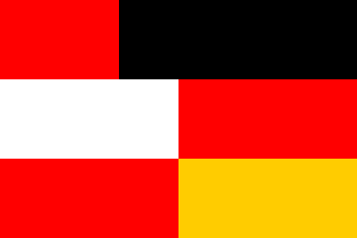 A flag divided vertically, the hoist half black-white-red, the fly half black-red-gold; the canton red. The flag-bearer is a social democrat. Caption: "Mit roter Socigösch geziert ist hier die Einigung vollführt" ("Decorated with a red Soci jack, the unity is executed"). Source: Kuhn 1991 [kuh91].