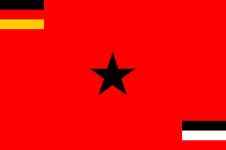A red flag with a black five-pointed star in the center, a small black-red-gold canton in the upper hoist, and a small black-white-red canton in the lower fly. The flag-bearer is a young communist. Caption: "Die letzte Ölung ist vollbracht, wenn Sowjet-Deutschland wart gemacht" ("The extreme unction is executed, when Soviet Germany is made"). Source: Kuhn 1991 [kuh91].