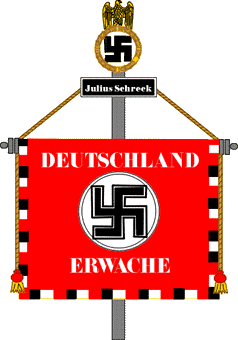 Keywords: germany | historical | nationalsocialist | nsdap | ss | schutzstaffel | vexillum | swastika | cross: swastika (black) | disc (white) | text: german | deutschland erwache | schreck: julius | garland (gold) | eagles: 4 (gold) | hitl |