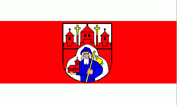 In a silver(=white) shield is a red embattled wall topped by three towers with triangular roofs. Between the towers are two golden(=yellow) Latin crosses stuck upon red poles. In the open gate is St.James dressed blue. In one hand he holds a red model of a church, in the other hand a golden(=yellow) stick with a bottle of the same colour.