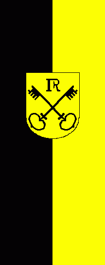 In a golden (= yellow) shield is a pair of black keys crossed per saltire. They are topped by an initial "R" of the same colour.