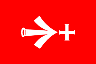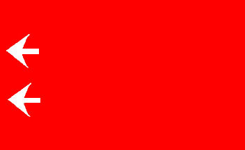 A plain red pennant with a white arrowhead shifted and pointing to the hoist.