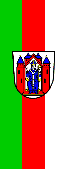 A banner [hanging flag] with green-red-white stripes and the arms. The arms are influenced by the fact that Aschaffenburg was a fortress of the diocese of Mainz until 1803. Sources: flag from Staack 1997, arms from Stadler 1964-1971.
