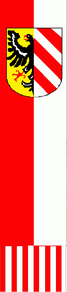 The ratio of banner is approx. 10:3. The banner is vertically divided into red and white and has a bannerhead containing one of the both coat of armst of arms of the city. The height of the bannerhead is 3/10 of total height.