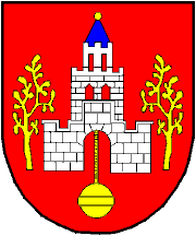 Coat of arms: Gules a castle argent with coned roof azure and ball or, with two stylized trees (hawthorn and linden) or; under the gate hanging