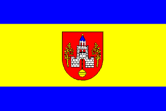See also:The flags and coat of arms of Emstek, in Kreis Cloppenburg, Land Niedersachsen, are from the Emstek municipal website. The flag has three horizontal stripes of blue and yellow. The yellow stripe is 1/2 flagheight. In the center thereof is the municipal arms. The flag can also be used as a banner. The colors are derived from the city arms: blue for the blue coned roof of the castle, and yellow for the ornamented capsule ("Desum-Knop").