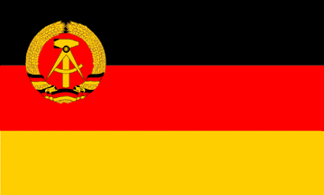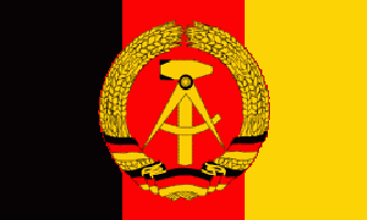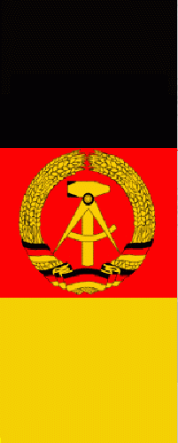 This flag was adopted on 1 Oct 1959, and continued in use as the flag of East Germany until the reunification of the Germanies on 3 Oct 1990 - one year after the fall of the Berlin Wall. Ratio 3:5. The coat of arms shows a hammer and compass in a ring of rye, symbolising the working class,