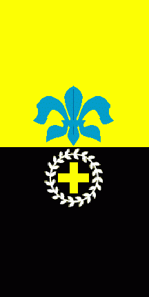 The shield is divided per fess. Above in a golden (= yellow) field is a celestial blue fleur de lis. Below in a black field is a golden (= yellow) Greek cross surroundd by a silver (=white) wreath of laurel.