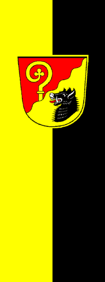 The Gemeinde Eitting adopted arms on 13th March 1967, blazon: Per bend sinister wavy: Gules, a crozier issuant Or; and Or, a boar's head Sable. On 29th September 1989 a flag was adopted. It is yellow-black and shows the arms.