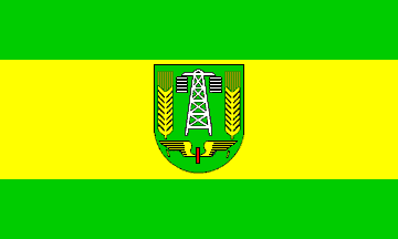 Falkenberg is a small town in Elbe-Elster county. It lies at the crossing of two important railroads, from Berlin to Dresden and from Leipzig to Cottbus. The importance of the railroads for the town is reflected in the arms. The flag was adopted in 1987 and is green-yellow-green in proportions 1:2:1 with the arms on the yellow stripe. The colours of the arms changed in 1993 (e.g. the field was red previously). Source: Günther 1995 (Erwin Günther, Ostdeutsche Stadtflaggen (1): Land Brandenburg, in Der Flaggenkurier, no. 1, 1995).