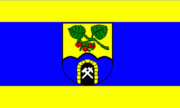 In a golden (=yellow) shield is a blue hill having three peaks. At its base is a black hole, the entrance of a mine, edged by golden (=yellow) stones. In the hole are silver (=white) hammer and mallet, crossed saltirishly. Above is a green branch of hazelnut having two leaves and three red nuts.