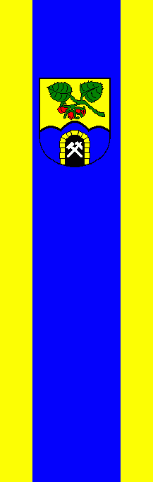It is a yellow - blue - yellow vertical triband with ratio 1:3:1. The coat of arms is in the blue stripe and shifted to the top.