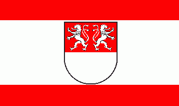 The flag's ratio is 3:5. It is a horizontal red - white -red triband with ratio 1:3:1. The coat of arms is in the middle of the white stripe, which is painted with a smaller size in Veddeler 2003.