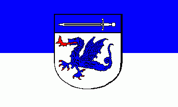 In a silver (= white) shield is a blue dragon, armed and tongued red. The blue chief is superimposed by a silver (= white) sword.