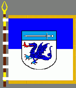 The ratio is 1:1. It is a blue over white horizontal bicolour with golden fringes. The coat of arms is in the centre of the flag. The flag is fixed by six white nooses on a polished wooden pole. The pole has two clads of brass and a gilded finial.