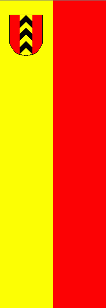 It is a yellow - red vertical bicolour. The coat of arms is on the top of the yellow stripe.
