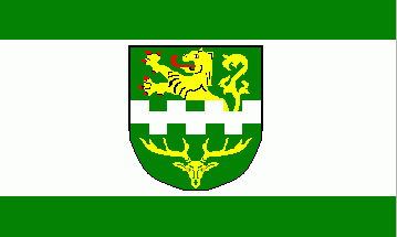 The banner of Bergisch Gladbach is white with two thin green stripes on the vertical edges and the municipal coat of arms in the middle.