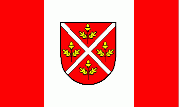 The red shield is divided by a silver (= white) saltire. In each quarter is a golden (=yellow) branch of oak having two leaves and one acorn.
