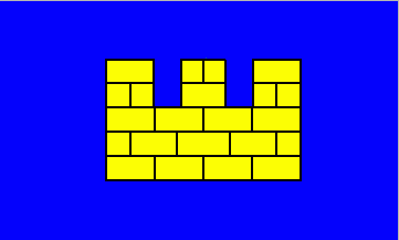 In a blue shield is a golden (=yellow) W-shaped,e mbattled wall masoned black.