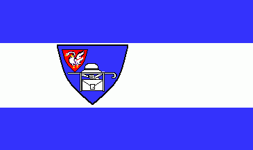 In a blue field is a bag for letters accompanied by a walking stick placed horizontally and a hat, all elements in silver (= white). In the dexter chief point is a red inescutcheon showing a silver (= white) swan armed golden (= yellow) and wearing a coronet of the same colour around its neck.