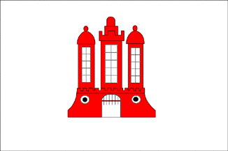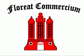 It is a white flag with a red castle in its centre. Above the castle is a black embowed Gothic inscription in Latin: "Floreat Commercium" (= "trade may flourish").