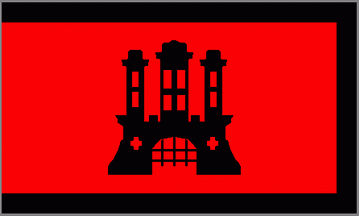 It is a Hamburg flag model 1751 with the castle centred, but red with a black castle and a black bordure on three sides without the hoist.